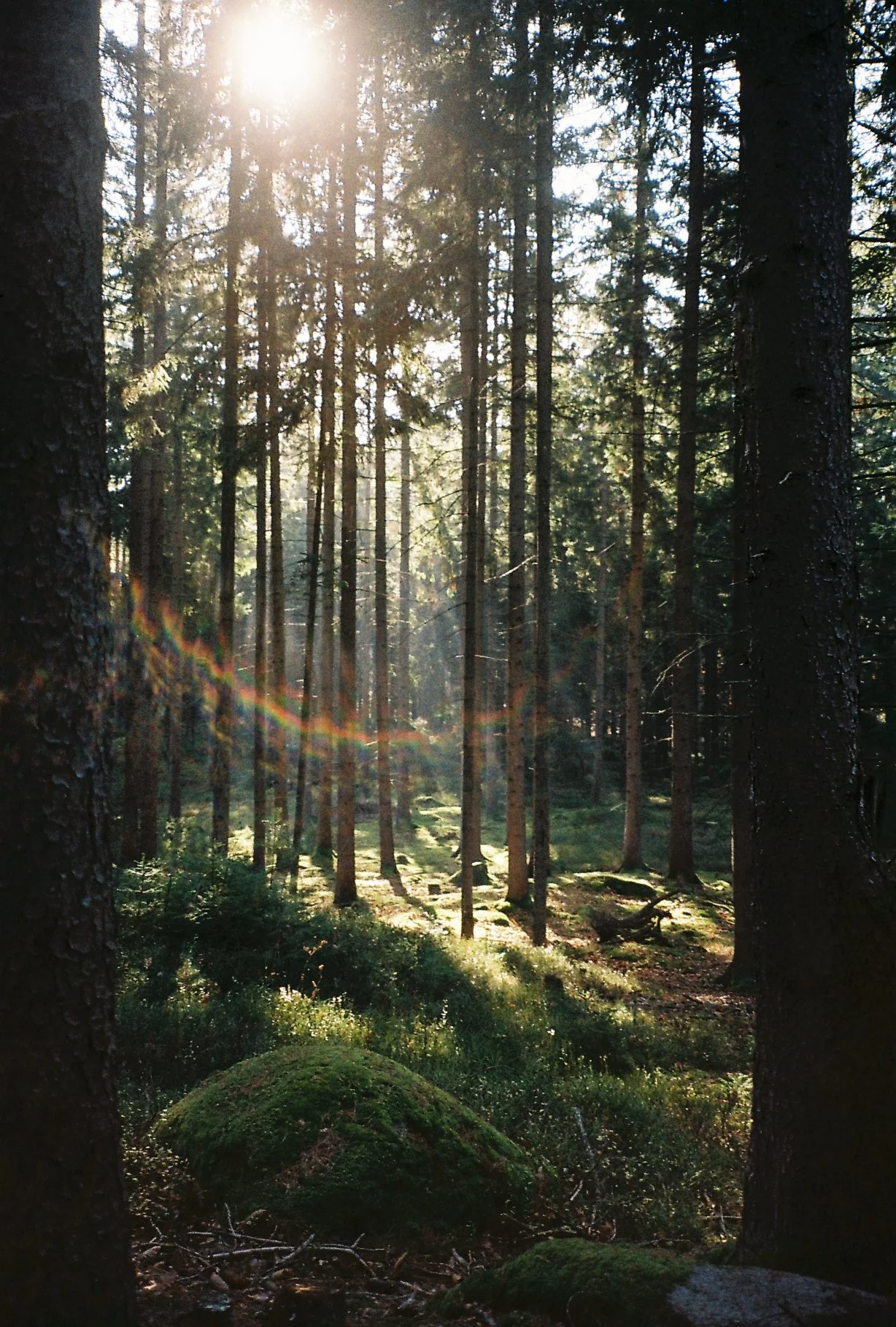 Der Boden ist bedeckt von weichem, dunkelgrünen Moos, das sich wie ein Teppich durch die Waldlandschaft zieht.